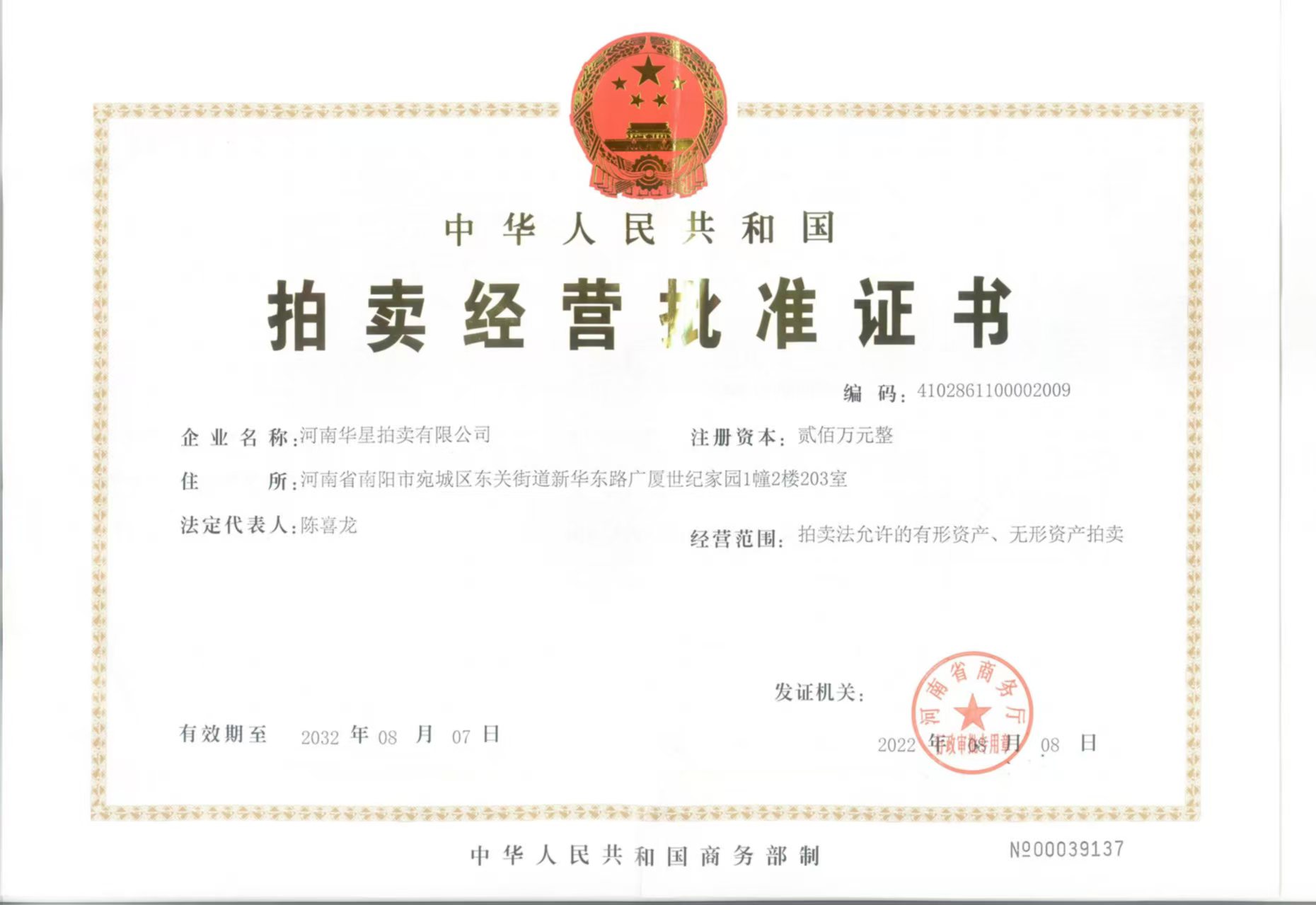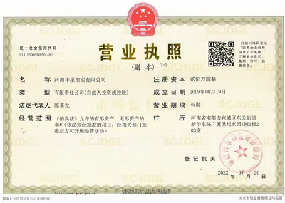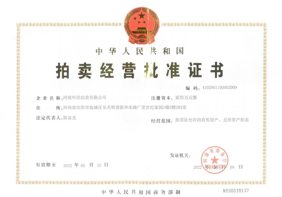 2013年7月取得南陽市人民政府指定、河南省財(cái)政廳頒發(fā)河南省公物拍賣資格證書