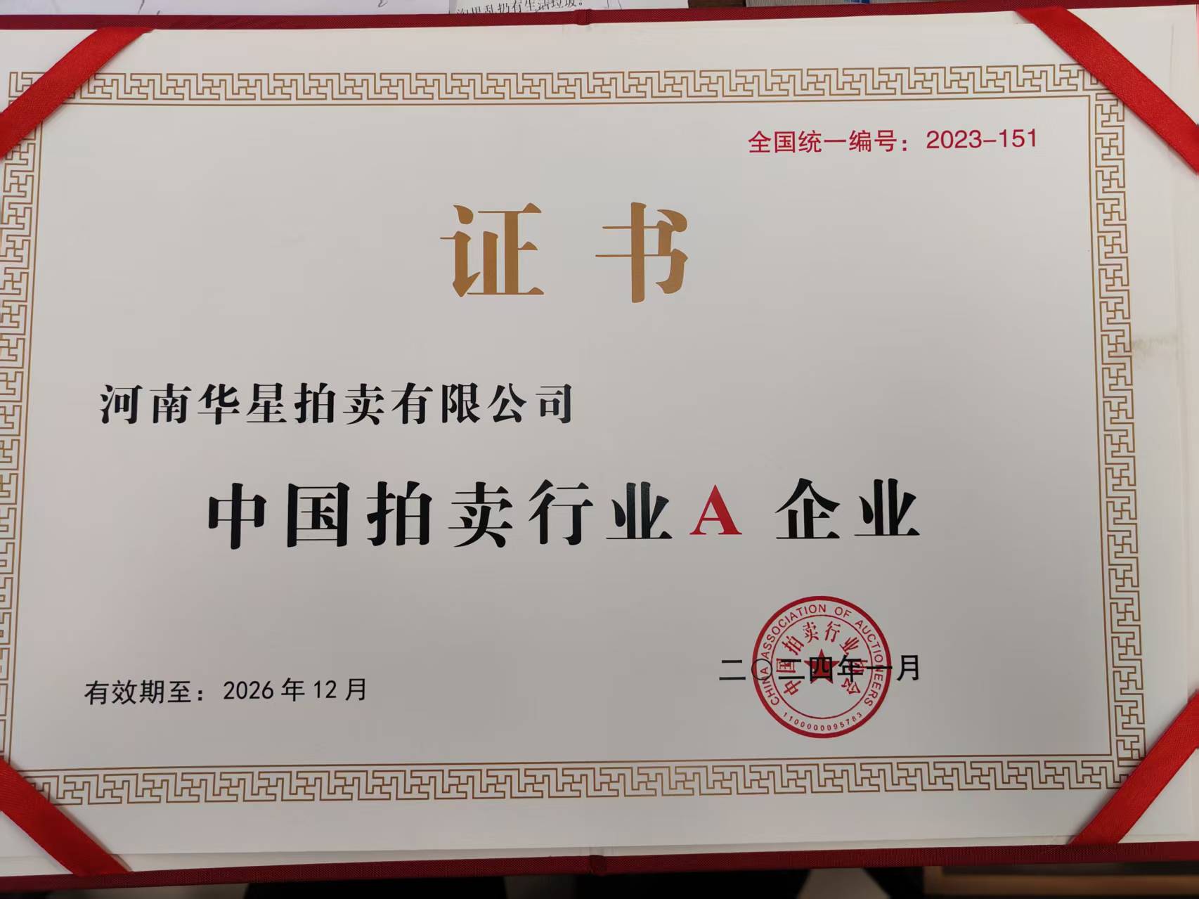 2023年12月我公司經(jīng)中拍協(xié)全國拍賣企業(yè)等級(jí)評(píng)估工作辦公室評(píng)為A級(jí)企業(yè)