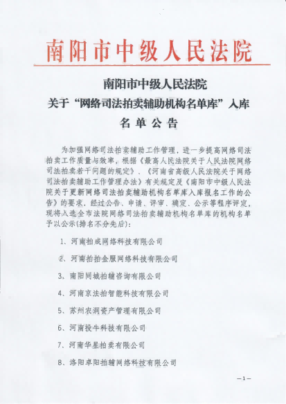 2025年1月入圍南陽市中級(jí)法院“網(wǎng)絡(luò)司法拍賣輔助機(jī)構(gòu)名單庫”